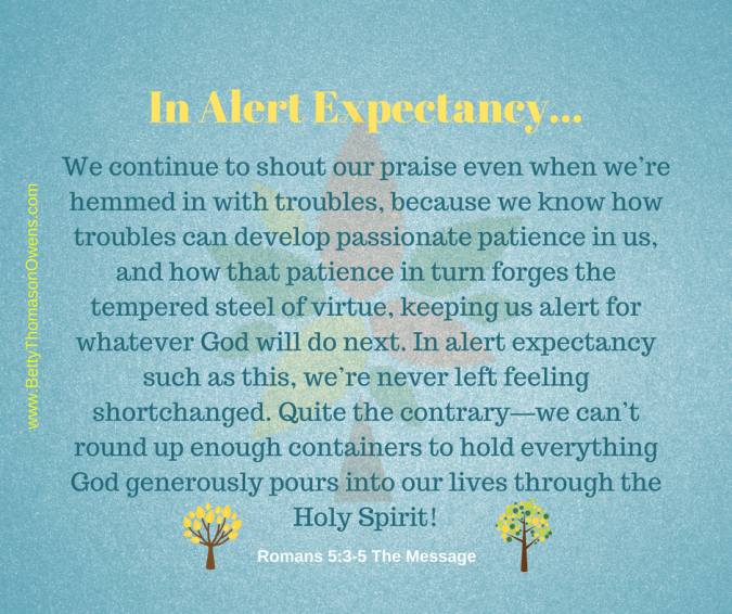Morning comes. I open the blinds to let in the bright sunshine and my heart is lighter. Hope is renewed. It’s baked fresh every morning, and its fragrance fills my spirit and lightens my load. I can do this. I CAN live in alert expectancy, waiting for the JOY that always follows.