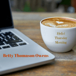 coffee, cup, laptop, memeFrom Betty Thomason Owens: Thanks for joining us today at Hello! Thursday Mornings. I hope you’ll be encouraged to follow Nike and check into her fiction releases, if you haven’t already. [Click the book photo above for more info at Amazon.com]